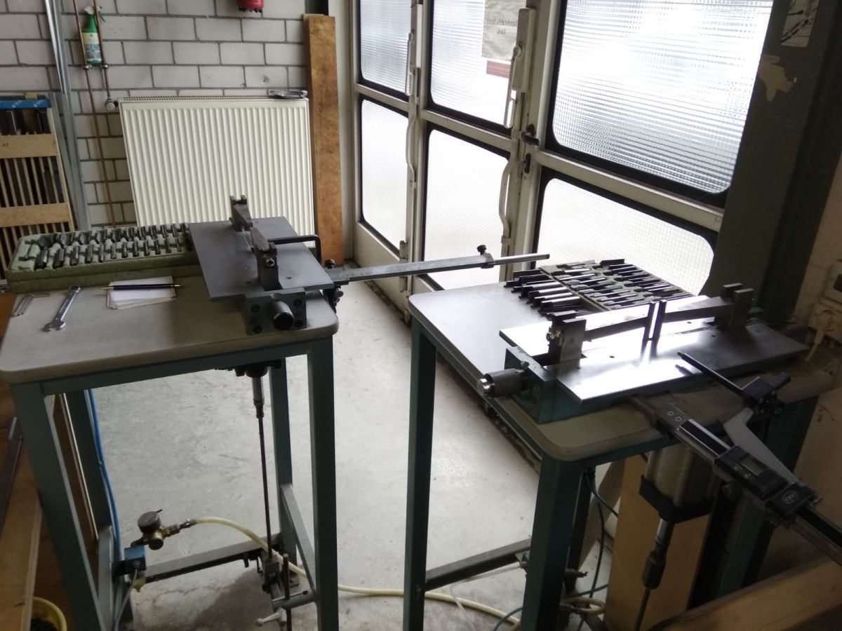 The classic Sandvik 33-0 bender, but assisted by penumatic force (tha´s why 33-0-P). Excellent machine wich allow to bend up to 50 mm height rules and 4 pt. with free-hands and just by pressing the foot pedal, the pneumatic becomes activated. Complete, with measuring device and full set of 24 tools